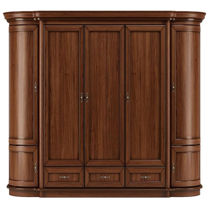 Features include a classic styling with curved fronts, a rounded body in natural veneer and solid wood, a warm walnut colour scheme, wooden doors with a silent closing system and three drawers.