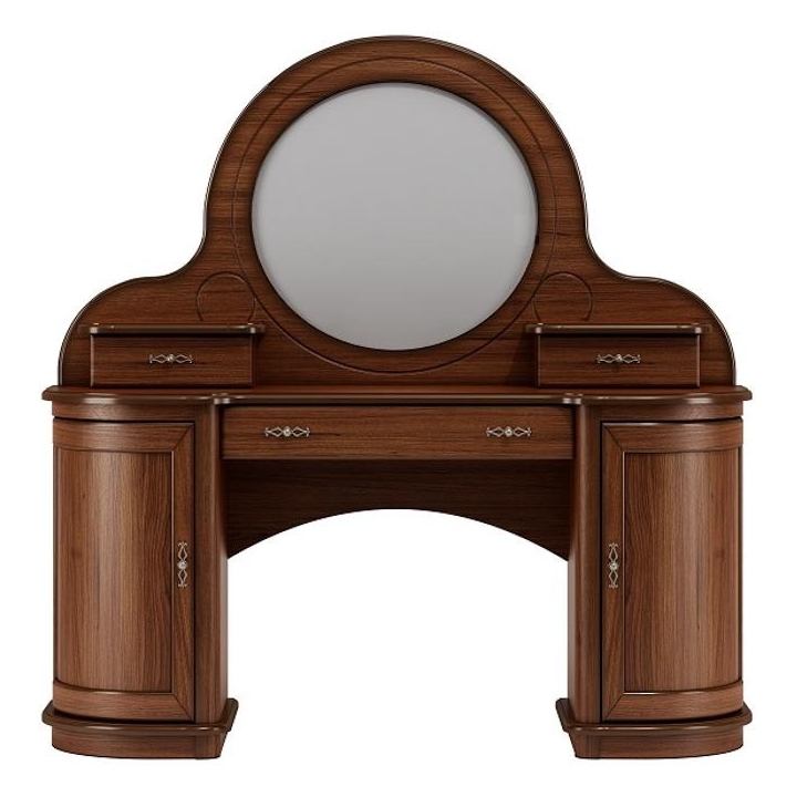 Features include a classic styling with curved fronts, a rounded body in natural veneer and solid wood, a warm walnut colour scheme, a round mirror, wooden doors with a silent closing system and three drawers.
