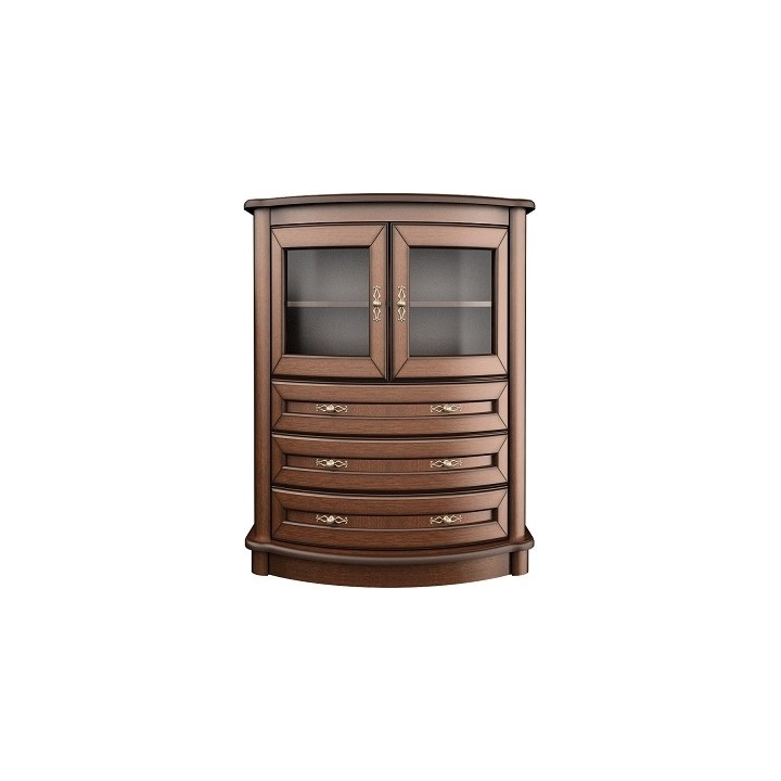 Features include a classic style with richly ornamented fronts, a rounded body, warm colours of brown natural veneer and solid wood, glazed doors with a silent closing system and three drawers.