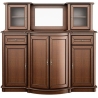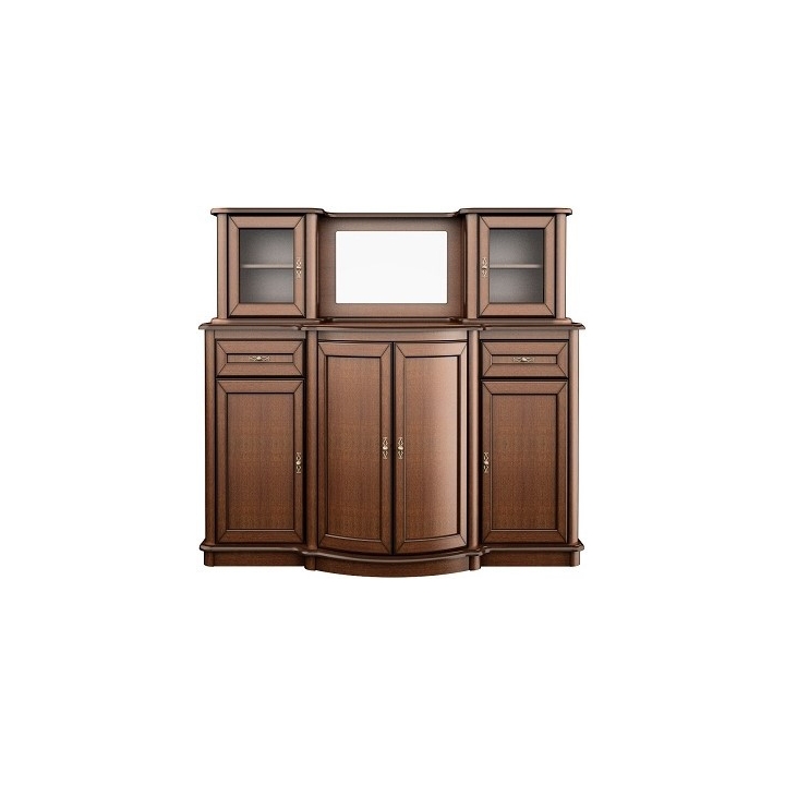 Features include classic styling with richly ornamented fronts, a rounded body, warm colours of brown natural veneer and solid wood, glass and wooden doors with a silent closing system and drawers.