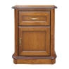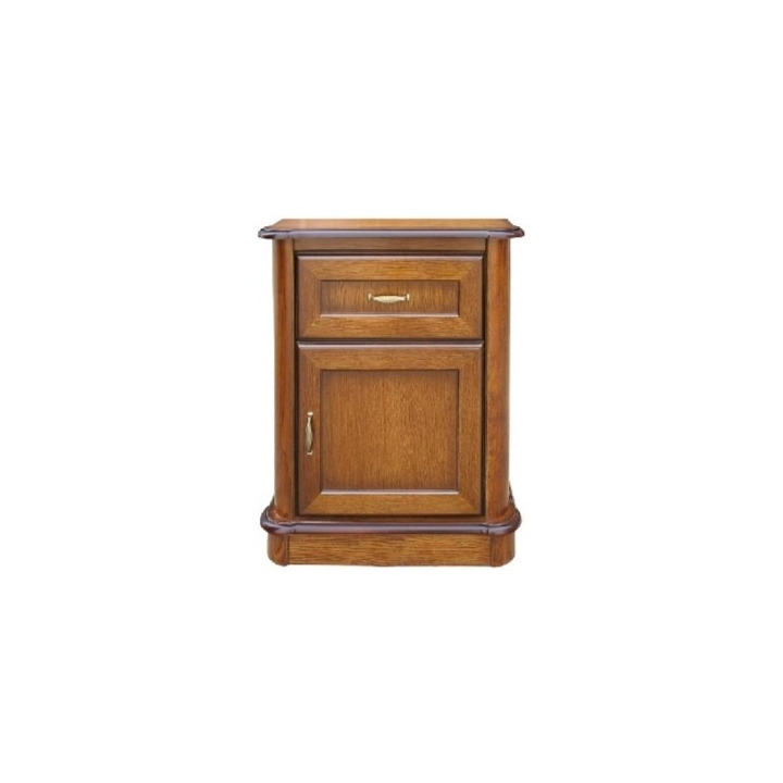 Characteristic features of the chest of drawers include classic design in the colour of antique cherry, construction from oak veneer and solid wood, doors with silent closing and metal handles in the colour of old gold.