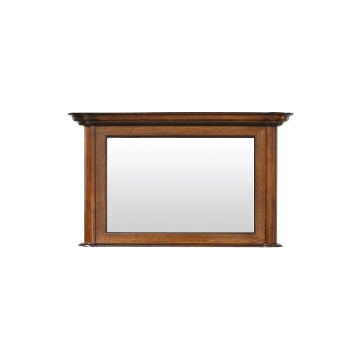 The features of the mirror are the classic design in antique cherry colours, the construction in oak veneer and solid wood, the decorative crown of the frame and the large glass surface of the mirror.