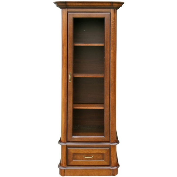 The Bavaria B09 show case comes from Art-Futuro. The Bavaria B09 vitrine is the perfect solution for those looking for a piece of furniture that will not only provide practical storage space, but will also be a beautiful decoration of the interior. Made of the highest quality wood and oak veneer, it guarantees solidity and durability for many years. This elegant display cabinet has been carefully designed to accommodate and display a variety of items in an aesthetically pleasing way. A collection of books, compact discs or travel mementos will look beautiful and, when sheltered by glass, are protected from dust. Fitted with a glass door, three solid shelves and a practical drawer, it allows you to display your favourite decorations, collections or memorabilia. Its finish in a warm cherry shade adds elegance and sophistication to the interior. The display cabinet not only offers functionality, but also stands out with its unique design. Precise detailing and careful finishing give it a unique character, emphasising the prestige of your interior. Aluminium handles in the colour of old gold are a beautiful accent, perfectly matching the timeless design of the furniture.