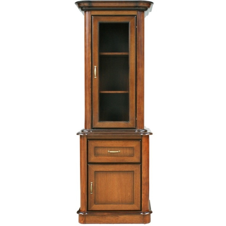 Features of the cabinet include classic styling in antique cherry colour, construction in oak veneer and solid wood, frame door with glass, drawer and door in the lower part and metal handles in old gold colour.