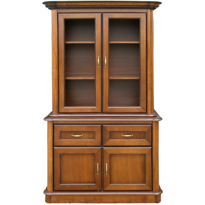 Features of the display cabinet include classic design in antique cherry colour, construction in oak veneer and solid wood, framed doors with glass, drawers and doors at the bottom and metal handles in old gold.