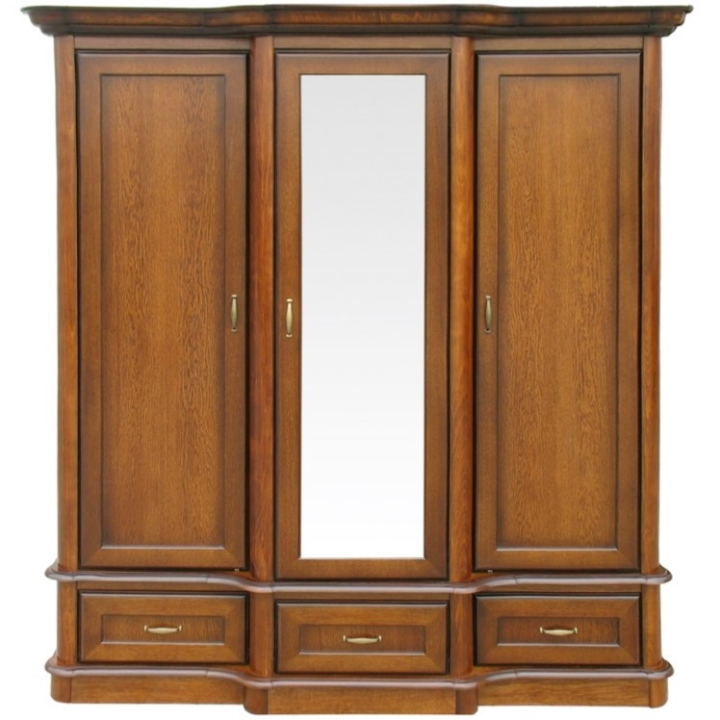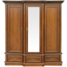 Characteristics of the wardrobe include classic design in antique cherry colour, construction in oak veneer and solid wood, central door with mirror, hinges with silent closing, three handy drawers and metal handles in the colour of old gold.