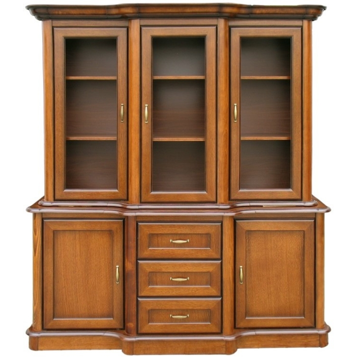 Characteristics of the cabinet include classic design in the colour of antique cherry, construction from oak veneer and solid wood, frame doors with glass, two drawers, hinges with a silent closing system and metal handles in the colour of old gold.