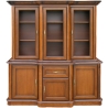 Characteristic features of the cabinet include classic design in the colour of antique cherry, construction from oak veneer and solid wood, frame door with glass, full extension drawer, hinges with a silent closing system and metal handles in the colour of old gold.