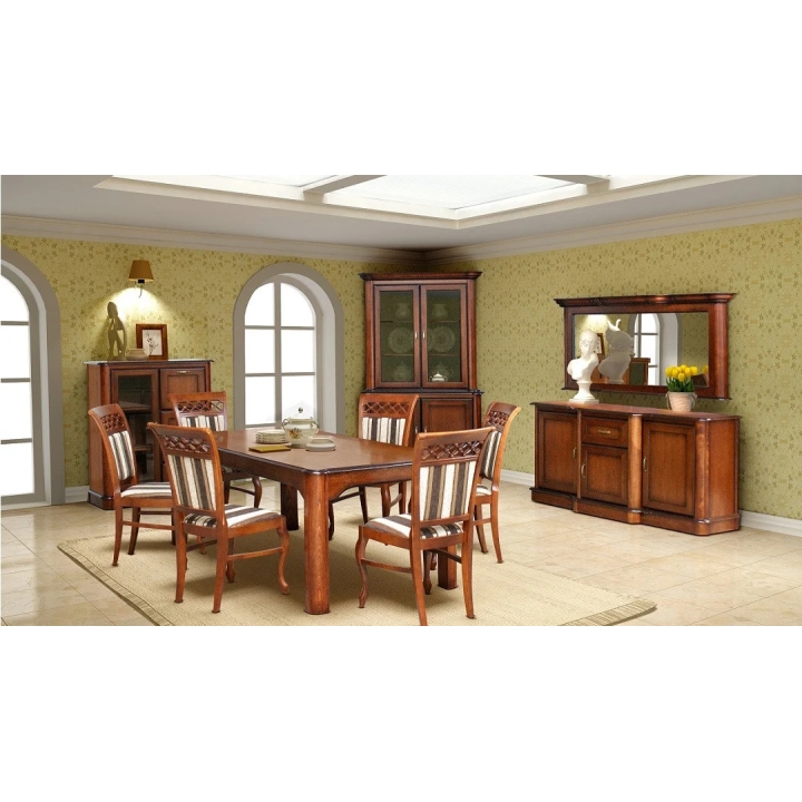 Features of the table include classic design in antique cherry colour, construction in oak veneer and solid wood, rectangular table top that can be extended up to 300 cm and solid wood legs.
