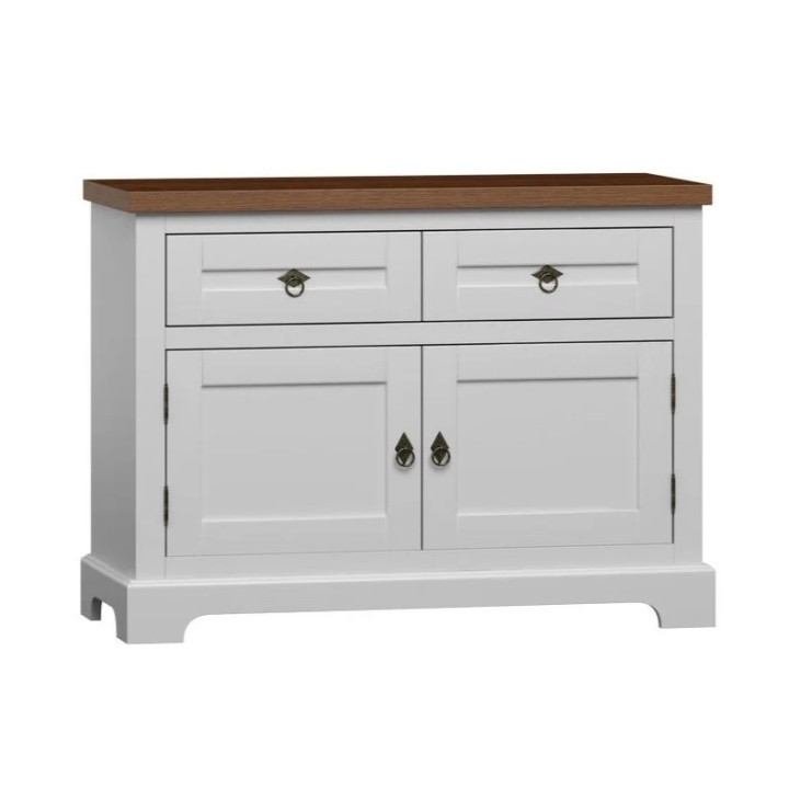 The characteristics of the chest of drawers are its classic Provençal-inspired design and veneered construction. The furniture has two capacious drawers with a silent closing system, and two doors concealing plenty of space. An internal shelf facilitates convenient space management.