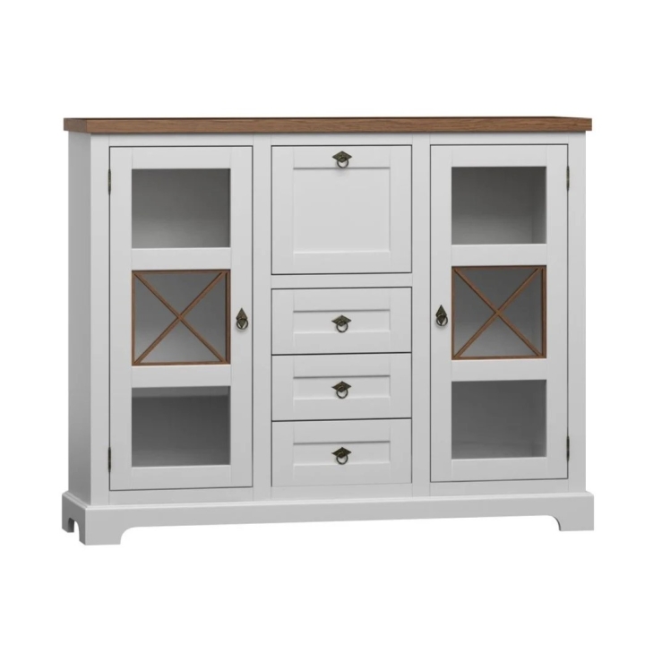 Features of the chest of drawers include classic styling and solid construction covered with oak veneer. The furniture is equipped with glass and solid doors, concealing four shelves and three drawers with a silent closing system, opened with metal knocker-type handles.