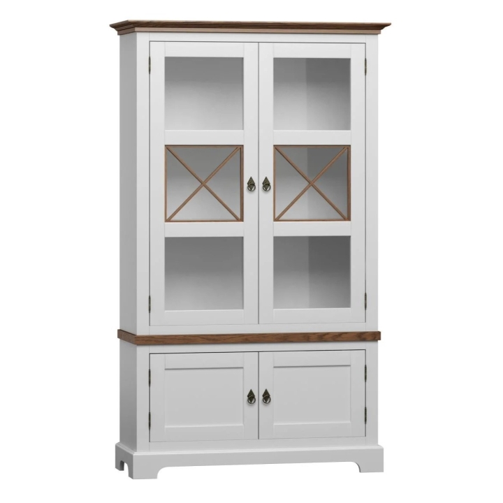 Features: four doors, including two glazed doors, three internal shelves, oak veneer construction, metal knocker handles.
