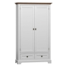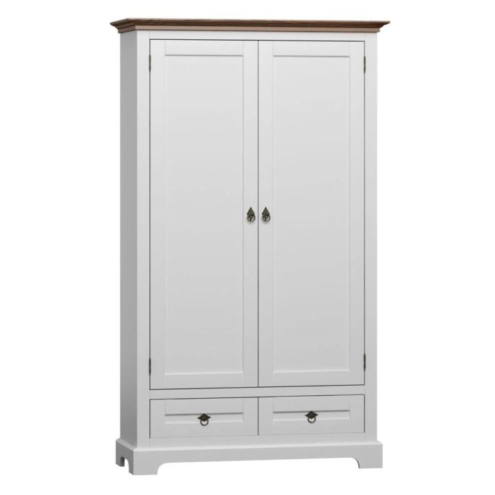 Features include oak veneer covered construction and knocker type metal handles. Two wide-opening doors and two drawers with silent closing offer space, while shelves and hanger rods inside the wardrobe help to organise this space.