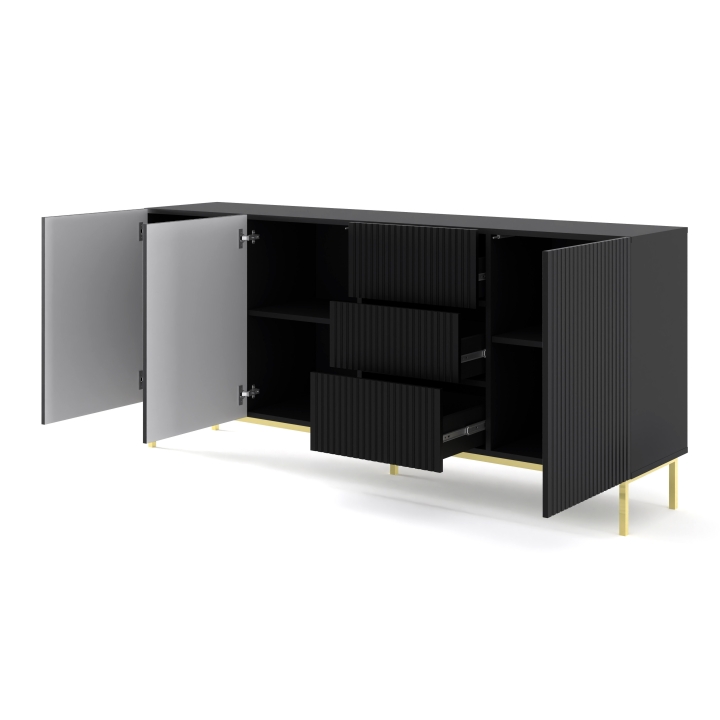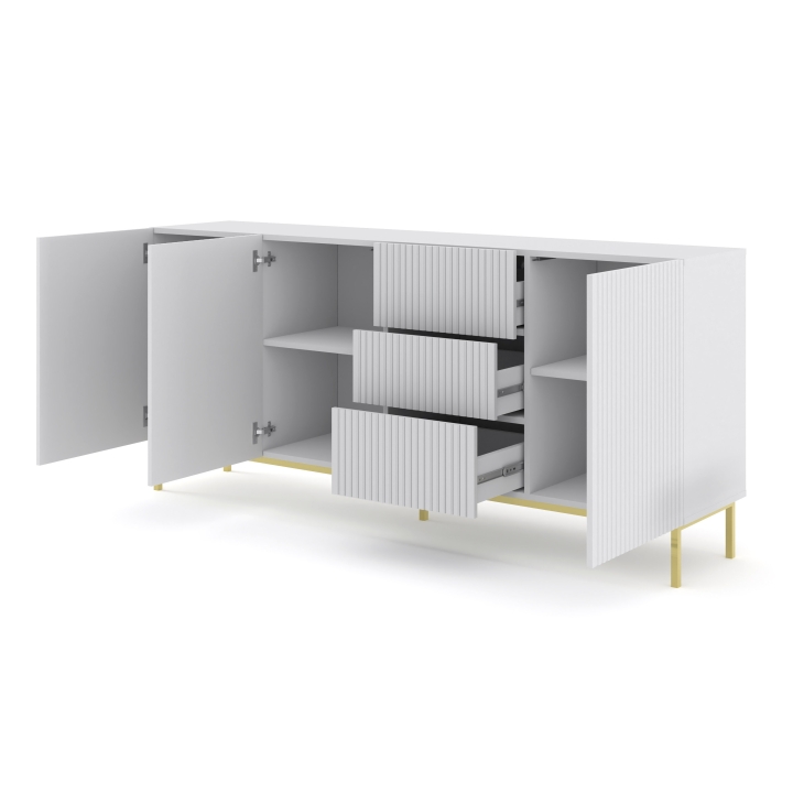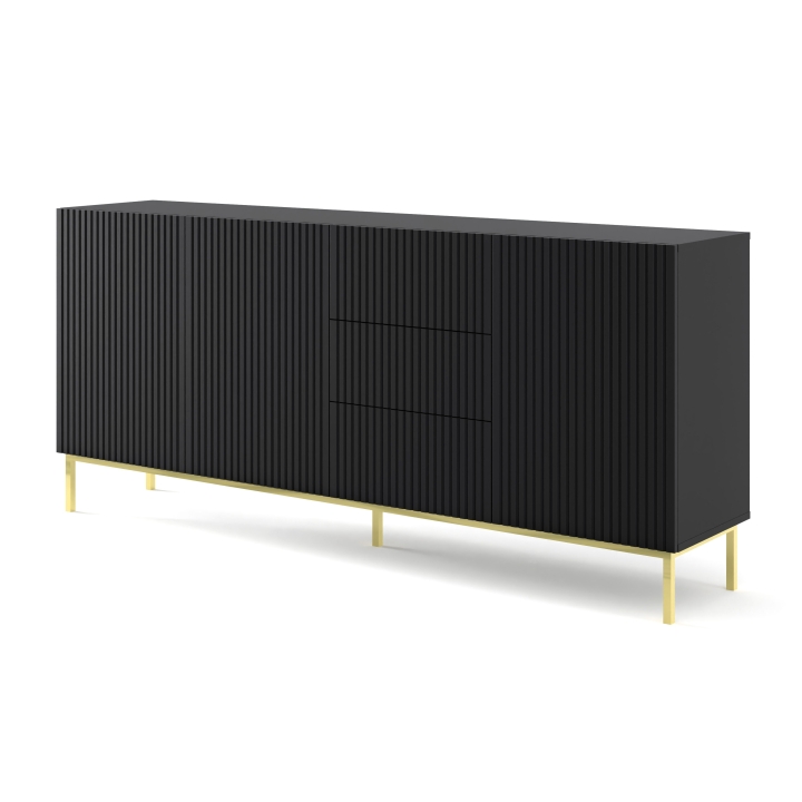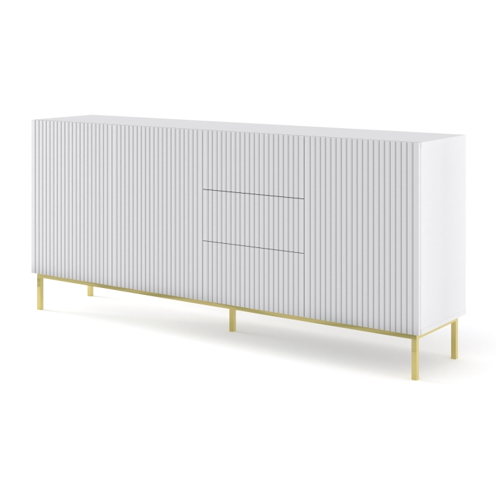 The 200 3D3S Ravenna chest of drawers comes from the manufacturer Bim Furniture. The fluted chest of drawers is 200 cm wide, making it ideal for larger spaces such as the living room, dining room or bedroom. The 200 3D3S Ravenna chest of drawers has three large drawers in the middle that offer space for storing a variety of items such as linen, clothes or accessories. On either side of the drawers are three cabinets with doors or hinged opening, which provide additional space for storing things. The chest of drawers provides ample storage capacity, thanks to the drawers and cupboards. You can easily organise various items in it, keeping the room tidy.
