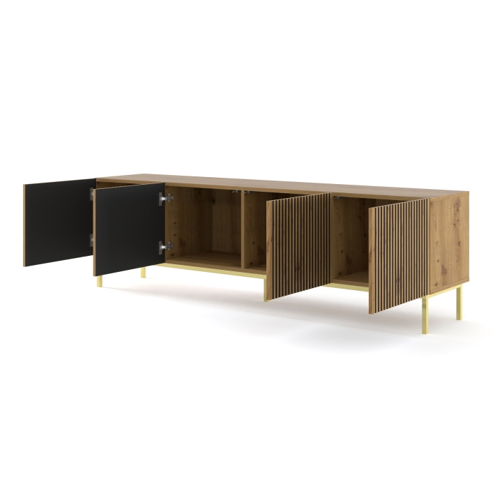 The RTV200 4D Ravenna F cabinet comes from Bim Furniture. The RTV200 4D Ravenna F cabinet has been meticulously crafted from durable materials for strength and long life. With a width of 200 cm, the RTV cabinet offers ample space to accommodate your TV, games console, set-top box and other media devices. In addition, four cabinets and open compartments provide enough space to store remote controls, cables, games and other items. The practical layout of the cabinet helps to keep the room tidy while allowing easy access to the things you need. The Ravenna F 200 4D RTV cabinet is not only a functional piece of furniture for storage, but also an aesthetically pleasing decorative element that enriches and complements the décor of a living room or lounge.