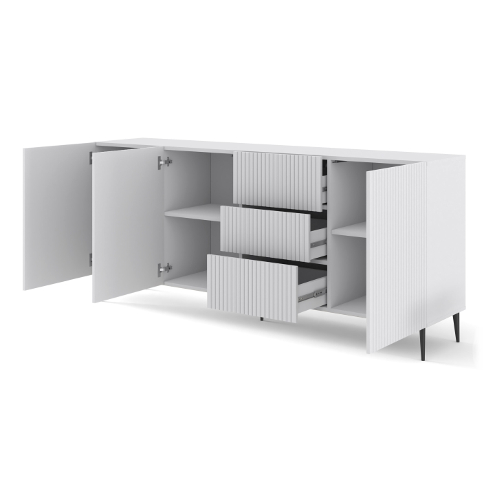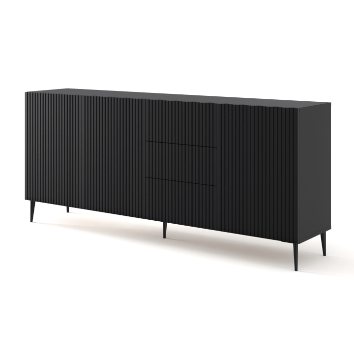 The 200 3D3S Ravenna chest of drawers comes from the manufacturer Bim Furniture. The fluted chest of drawers is 200 cm wide, making it ideal for larger spaces such as the living room, dining room or bedroom. The 200 3D3S Ravenna chest of drawers has three large drawers in the middle, which offer space for storing a variety of items such as linen, clothes or accessories. On either side of the drawers are three cabinets with doors or hinged opening, which provide additional space for storing things. The chest of drawers provides ample storage capacity, thanks to the drawers and cupboards. You can easily organise various items in it, keeping the room tidy.