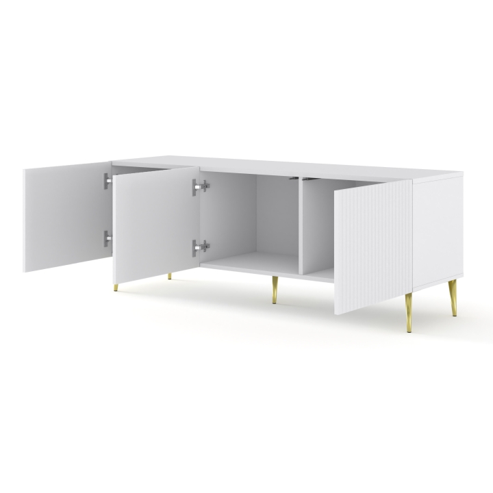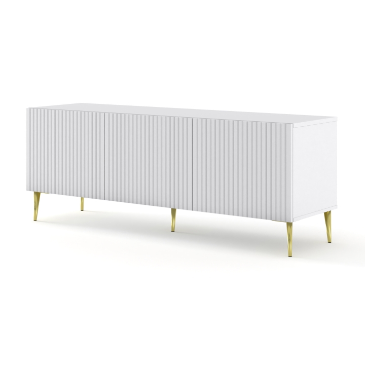 The 150 3D Ravenna RTV cabinet comes from Bim Furniture. The RTV 150 3D Ravenna cabinet is a stylish, fluted piece of furniture designed to store RTV equipment (TV, DVD player, etc.) and accessories in the living room or living room. The cabinet is 150 cm wide, making it suitable for larger televisions and provides sufficient space for a variety of RTV equipment. It provides adequate space for storing RTV equipment and accessories. The drawers make it easy to keep things tidy, and the shelves or side spaces allow for convenient placement of equipment and decorations.