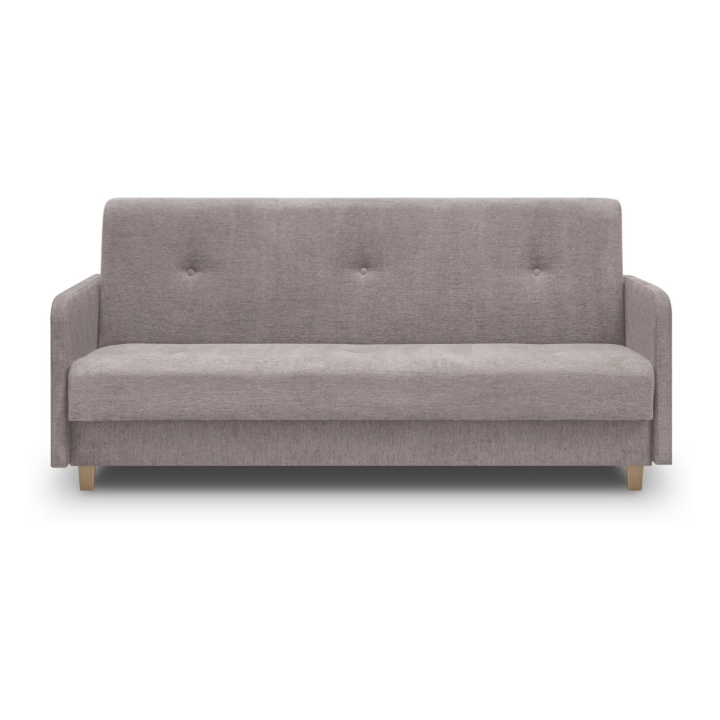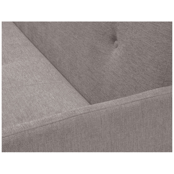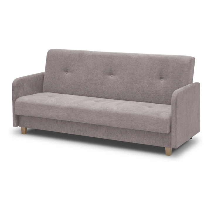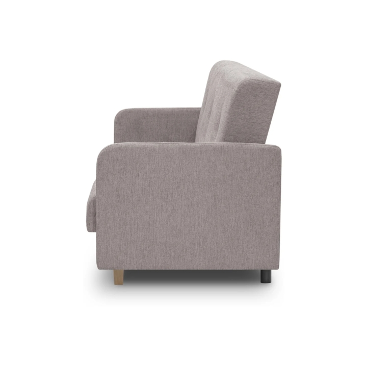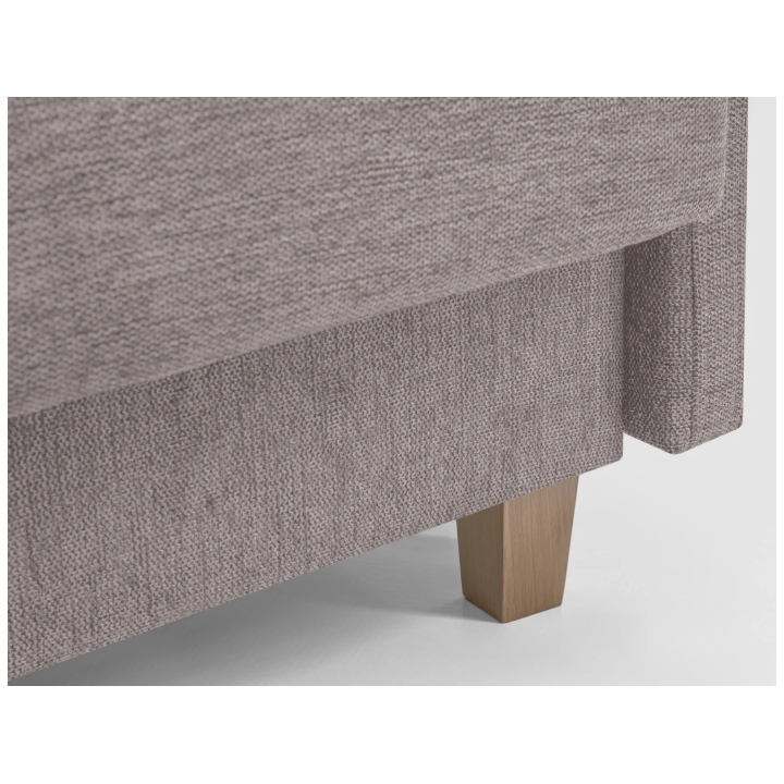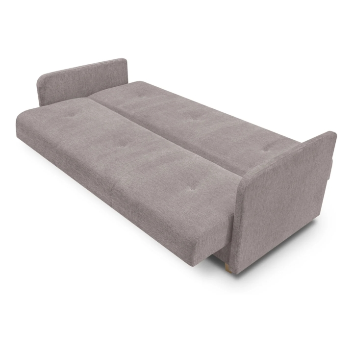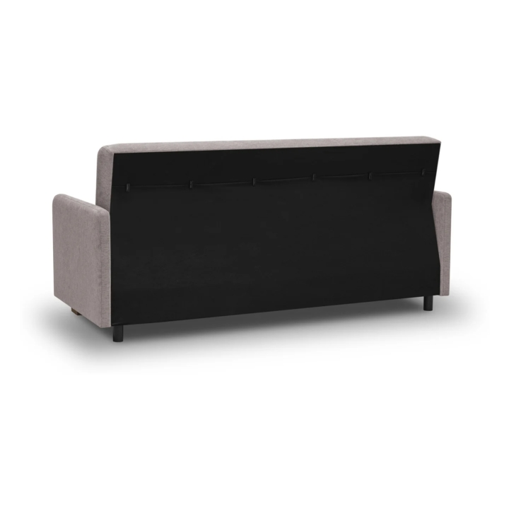 The seat, 185 cm wide and 55 cm deep, is positioned at a height of 43 cm from the floor, which promotes comfort when sitting for longer periods. The integrated reclining mechanism allows the furniture to be quickly transformed into a bed, and there is a bedding container under the seat for easy storage of duvets and cushions.
