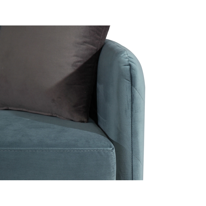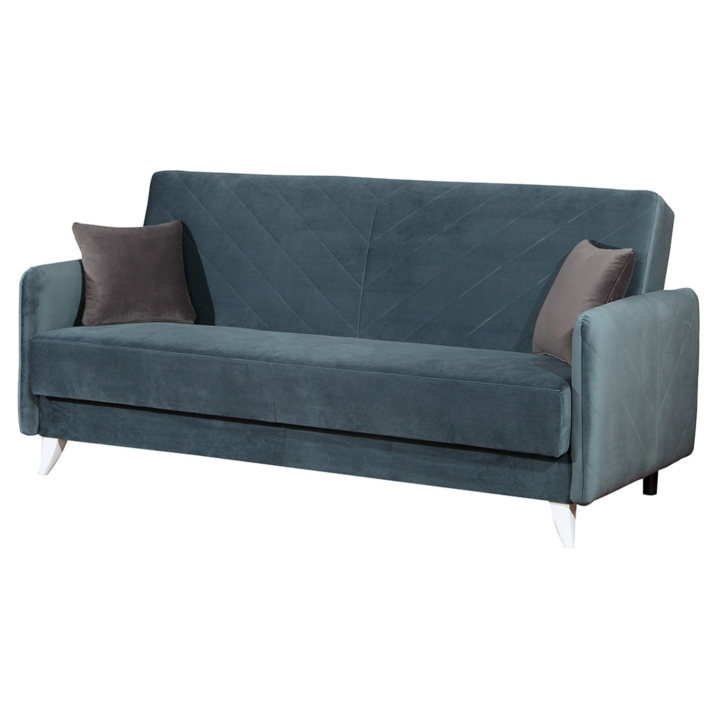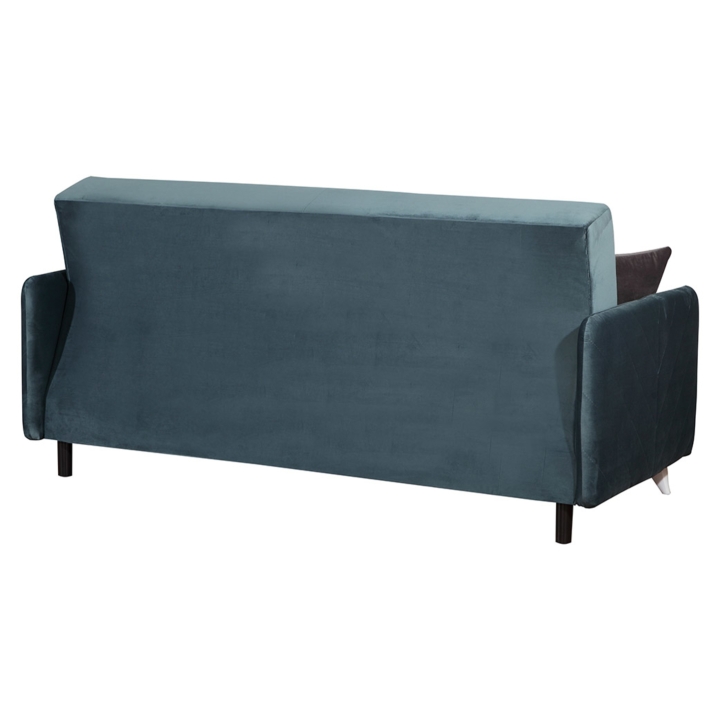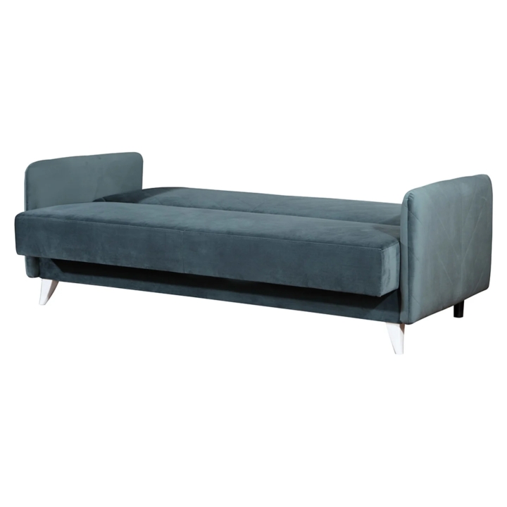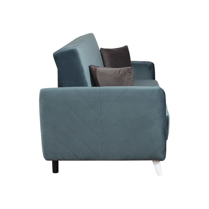 The model in a light shade of blue goes well with accessories in pastels and natural wood. The set also includes decorative cushions, which add a fresh and eye-catching touch. The overall dimensions are 210 x 100 x 100 cm and the sleeping area when unfolded is 190 x 125 cm.