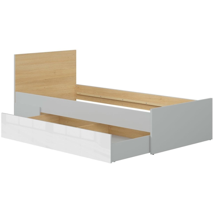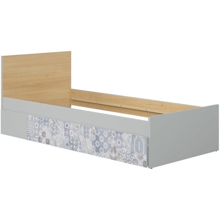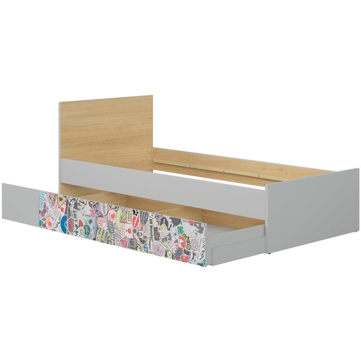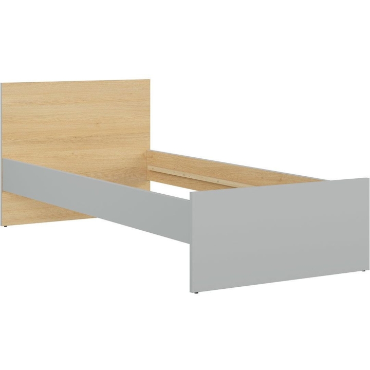 The bed is made of hard-wearing furniture board in the colours of light grey and Polish oak. The natural shades of wood, combined with cool grey, create a consistent and universal base for all kinds of accessories - from colourful bedding to decorative cushions and LED lights. This makes it easy to adapt the bed to an interior that changes with the age of the child.