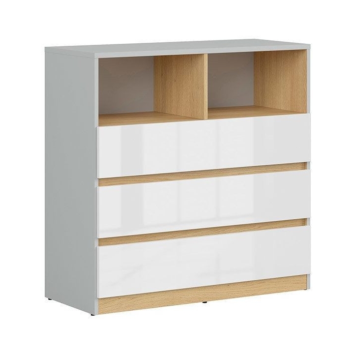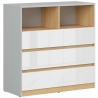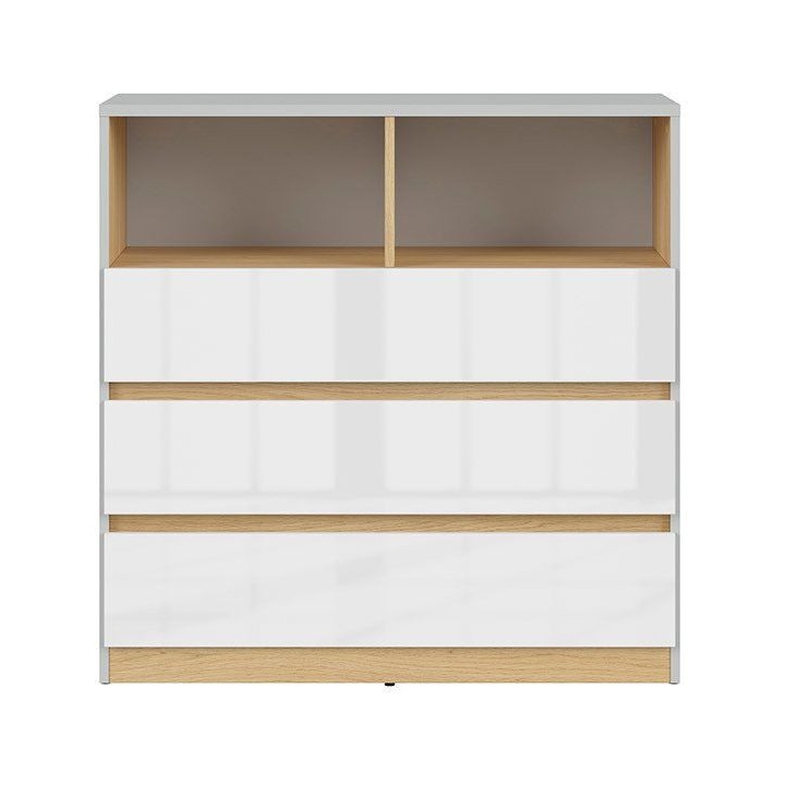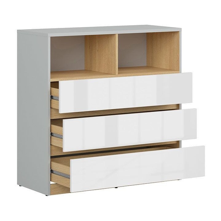 The modern character of the chest of drawers is emphasised by the smooth, handle-free fronts in the fashionable colour white gloss, which provide a contrast to the light grey body with elements in the Polish oak décor. The overall look is stylish, neutral and suits both girls' and boys' rooms. In addition, there is the option of personalisation - the top drawer is also available with a digital print (optional), e.g. with a cartoon motif.