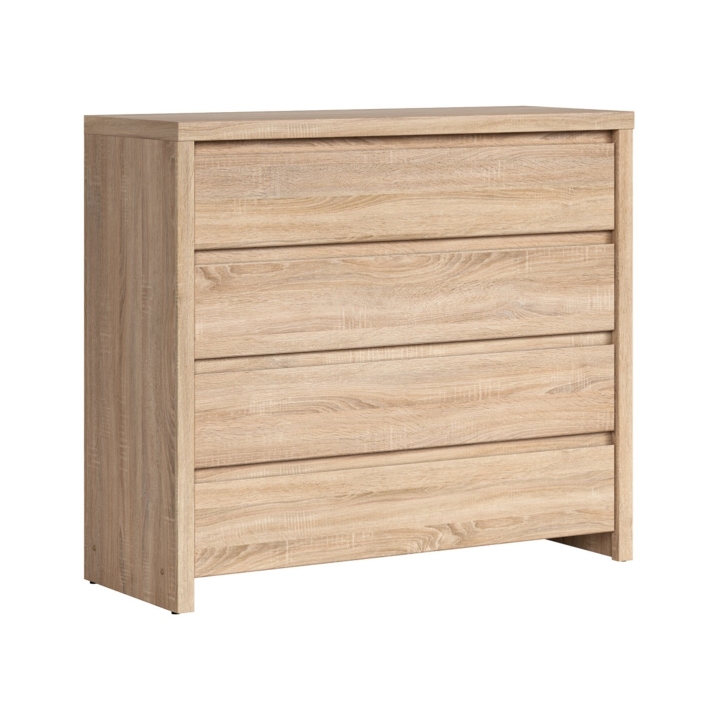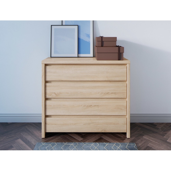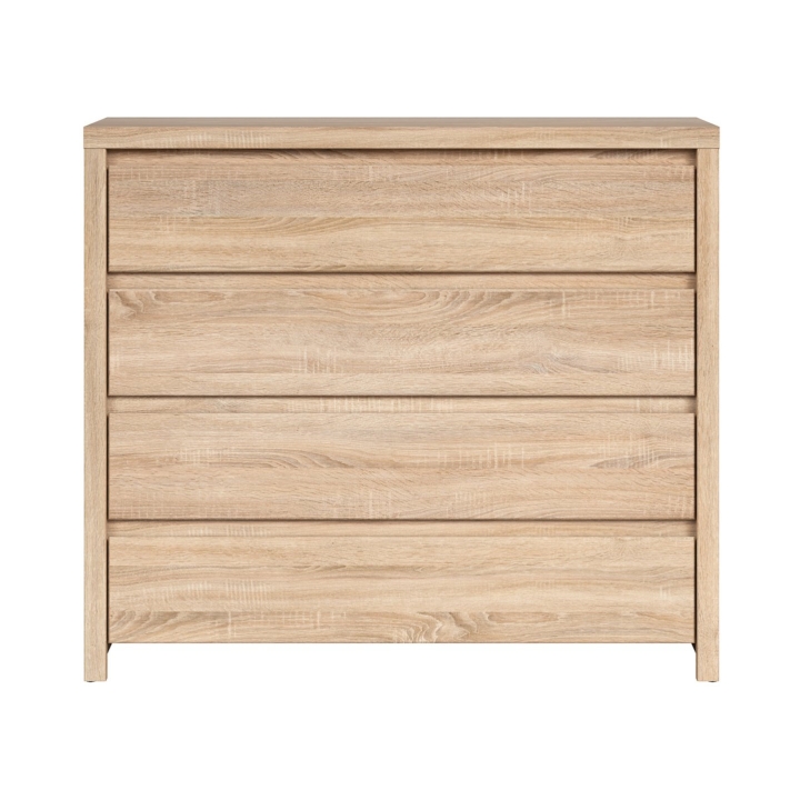 Kaspian chest of drawers from the renowned Black Red White brand is a functional piece of furniture with a solid structure, made of durable furniture board in oak sonoma décor. Its well-defined, geometric shape gives the interior an orderly and modern character, and the warm, beige shade of the veneer perfectly matches natural arrangements. With a width of 105 cm, a depth of 40.5 cm and a height of 92 cm, the chest of drawers is ideal for use in the bedroom, living room or hallway. Equipped with four capacious drawers, it allows you to conveniently store clothes, documents or small accessories. The handle-less fronts open comfortably thanks to subtle milling, which enhances the minimalist look of the furniture. The chest of drawers weighs 43.05 kg, which ensures stability but still allows for repositioning if necessary. The Kaspian model is for those looking for practical solutions with a modern but subdued design.