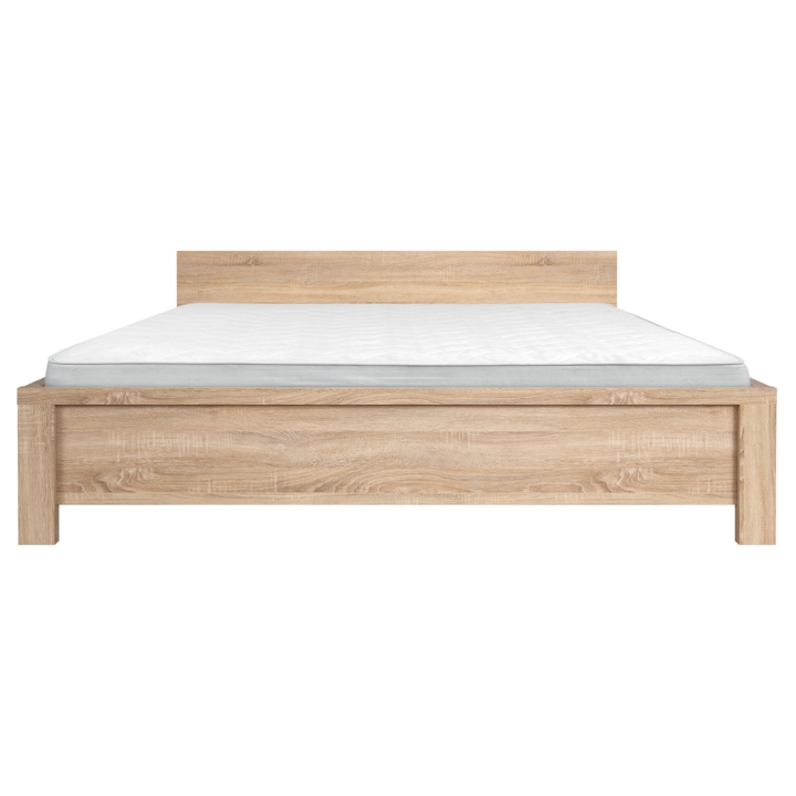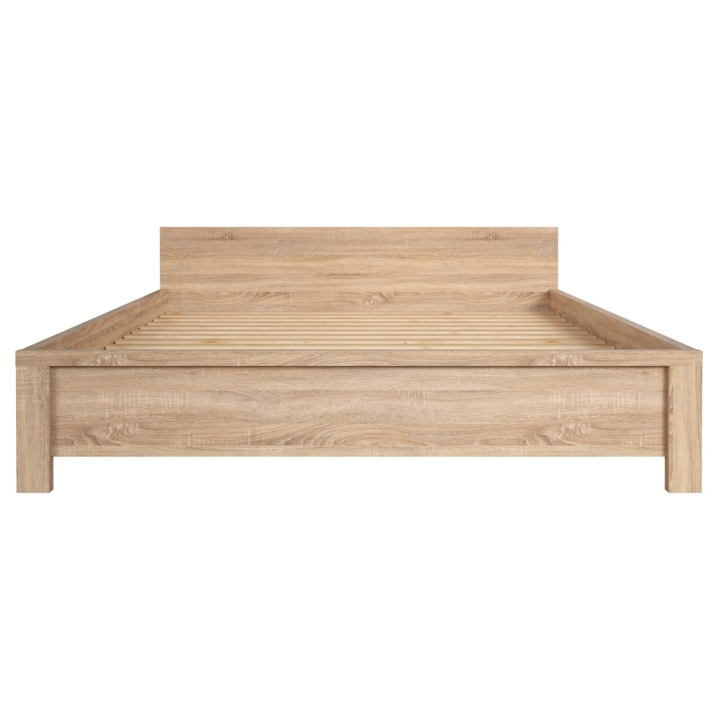 Kaspian 140x200 cm bed from Black Red White is a solid proposal for lovers of modern, functional interiors. Made of durable furniture board in oak sonoma décor, it is characterised by beige colours and structure imitating natural wood grain. The simple design, low construction (35-60.5 cm) and subtle legs make the bed fit perfectly into Scandinavian or eco aesthetics. The lack of a bedding container gives more freedom in arranging the space under the furniture - it can be used as additional storage space. The model has a universal orientation and is suitable for a mattress with a sleeping surface of 140x200 cm. The bed is sold without a mattress and frame, allowing you to individually select elements to suit your needs. Thanks to the simple construction, assembly is quick and easy. The furniture is manufactured in Poland to high quality standards.