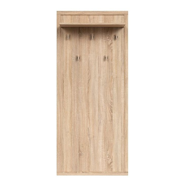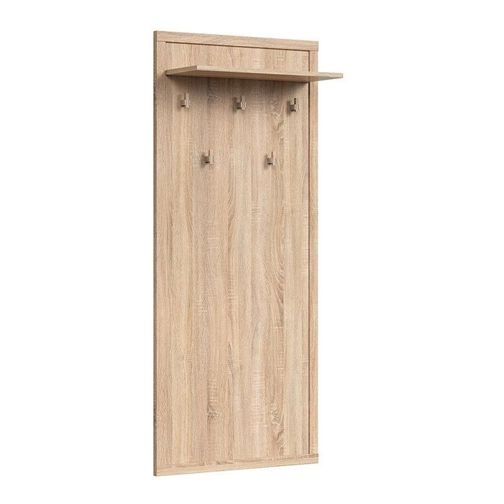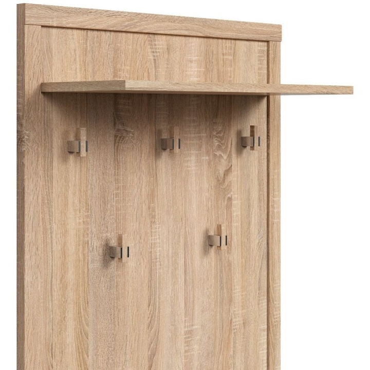 With a width of 66 cm and a height of 152 cm, the Kaspian WIE wall hanger is a practical piece of hallway furniture designed for everyday use. Made of chipboard covered with finish foil in the colour of oak sonoma, it reproduces the structure of natural wood. Fitted with five metal hooks, it allows you to conveniently hang up jackets, bags or rucksacks. The top shelf, 24 cm deep, works well as a place for hats, scarves or other small accessories. The vertical form saves space in narrow corridors. Thanks to its neutral finish, it can be combined with other pieces from the Kaspian collection or with furniture in a similar style. The weight of 14.9 kg ensures adequate stability after assembly. The product is designed to be cleaned with a damp cloth, without using strong detergents. The hanger is available in several colour versions, making it easy to match with different interiors.