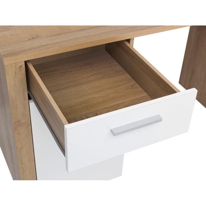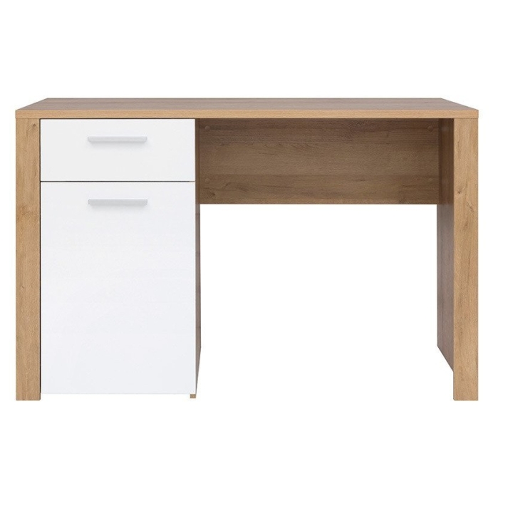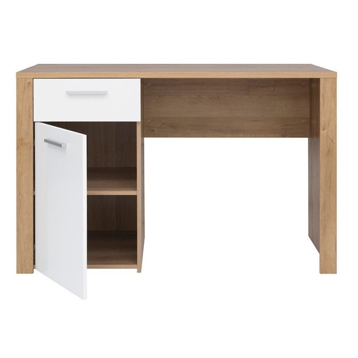 The Balder desk from Black Red White is a functional desk with a wide top ideal as a place to work. Store office accessories in the handy drawer, and you can always have important documents at hand thanks to the capacious cabinet. The geometric line and design of the furniture is emphasised by the bold slats of the cabinet. The colour of warm oak riviera has been combined with neutral white gloss to create a universal base for decorations. Comfort of use is ensured by branded accessories and simple handles. Combine the Balder desk with other pieces from the collection to create a coherent arrangement of your interior. Thanks to the many different modules, you can furnish your living room, bedroom and youth room as you wish.