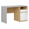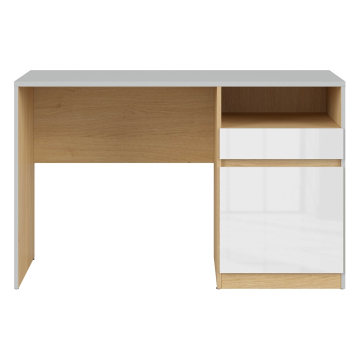 Are you looking for the perfect desk to inspire your child's learning and creativity? The Nandu desk is more than just a piece of furniture - it is a centre of scientific discovery for the young mind. Created with the needs of teenagers in mind, it combines modern design and functionality. Its long top provides ample space for creative projects, while the practical drawer and cupboard will hold all the necessary school supplies. The durability of the Nandu desk is emphasised by the scratch-resistant lacquered top. The carcass in shades of grey and polish oak combined with the glossy white fronts creates an elegant yet welcoming look. For those who want to add a touch of originality, the option of a drawer front with a unique digital print is available. Handleless and fitted with soft-close hinges, this desk not only makes work easier but also more comfortable. By creating a youth room with the Nandu desk and other pieces in the collection, you give your child a space to study, entertain and develop their passions. With dimensions of 120 cm in length, 57 cm in width and 75.5 cm in height, the Nandu desk will fit perfectly into any youthful interior.