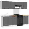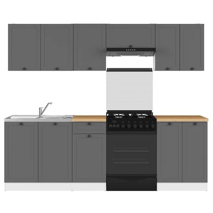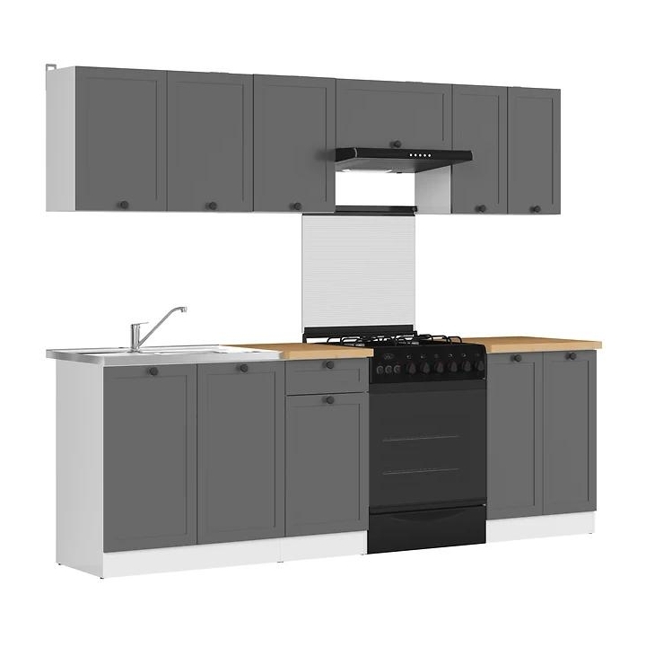 The Junona Line kitchen furniture set creates a space conducive to cooking and ensures high comfort during everyday use. Thanks to its well-thought-out design, even a small kitchen will become a place full of possibilities. With a width of 240 cm, the set allows you to separate areas for washing up, preparing meals and storing provisions. The capacious upper cabinets accommodate all the necessary utensils, while the lower cabinets provide space for pots and kitchen accessories. The white carcasses and grey fronts work perfectly with the countertop in the shade of oak craft to create a harmonious whole. Black round handles add a modern touch to the piece. Junona Line is the ideal choice for those who wish to create a kitchen that is a real pleasure to use. The set is sold with a worktop.