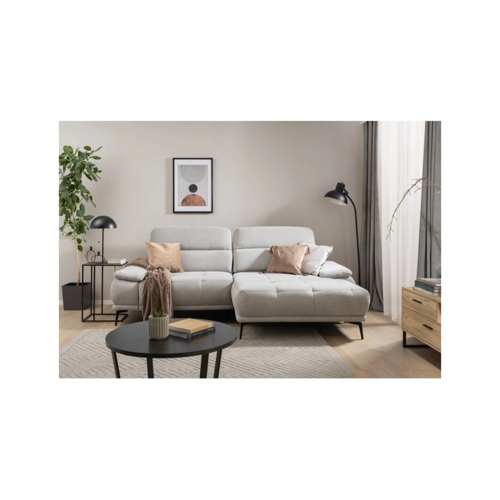 The contoured armrests, softened with an additional cushion, offer stable support and comfort, allowing you to find the perfect position for resting. Decorative pulls and stitching add a sophisticated touch to the corner sofa, which fits perfectly into modern interiors.
