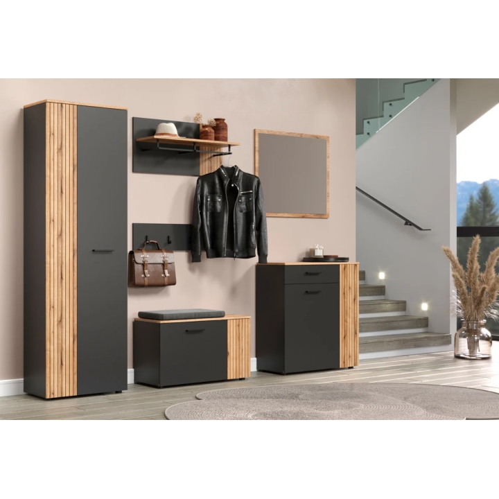 The colour combination of graphite and evok oak gives the Esteban wardrobe a unique character. This set of colours fits perfectly into modern, loft-style interiors, introducing a subtle accent to them. The milled fronts and patinated riffles are a unique decorative element, emphasising the uniqueness of this piece of furniture, which combines modern aesthetics with classic elements.