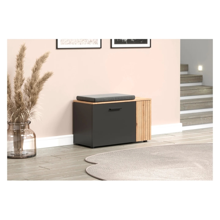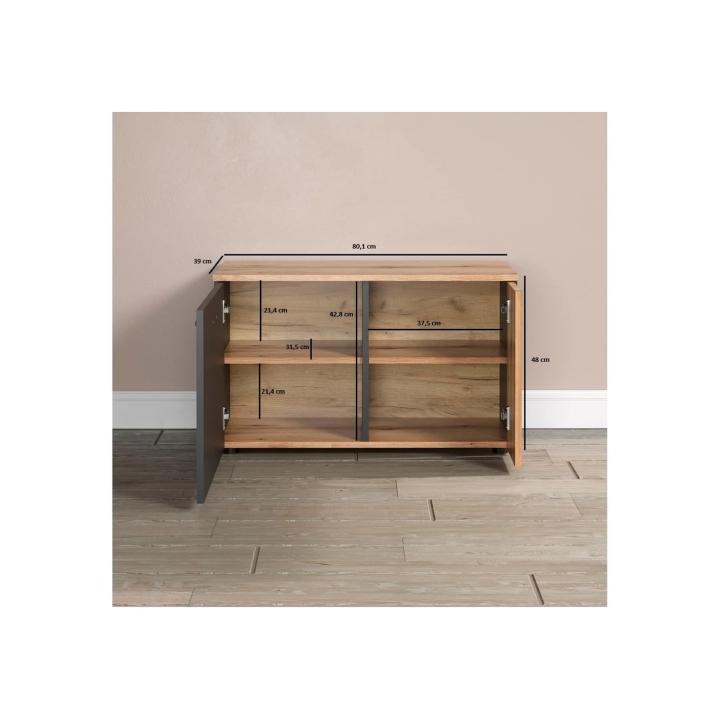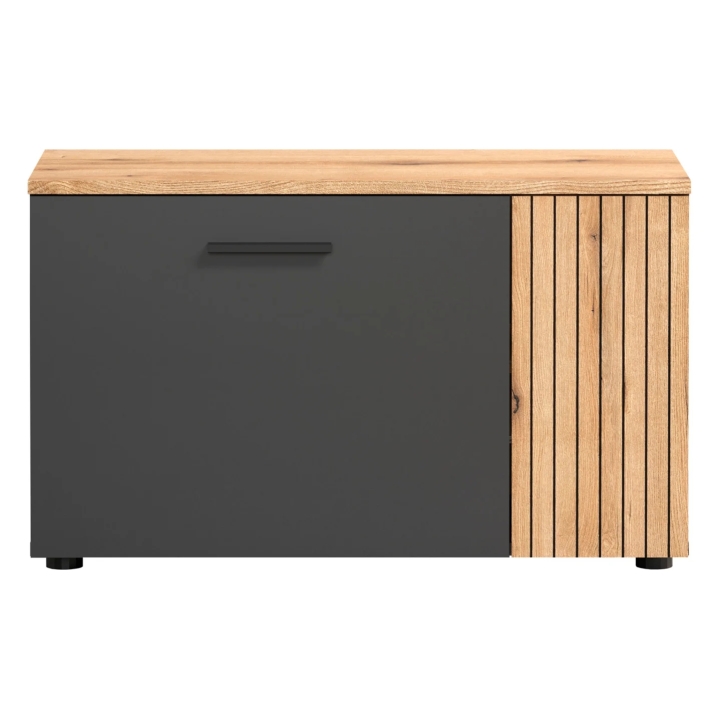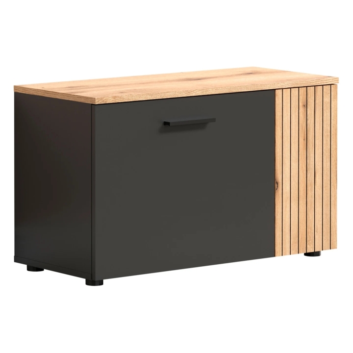 The Esteban SFK1Dshoe cabinet from manufacturer BRW is the perfect solution for a hallway, offering comfort and a tidy space while maintaining a modern design. Measuring 80.1 cm in width, 48 cm in height and 36 cm in depth, this furniture in graphite colour with an oak body is a subtle yet distinctive interior decoration. The use of highly scratch-resistant laminated board makes the cabinet durable and easy to keep clean.