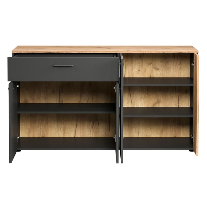 The furniture is equipped with four doors and one drawer to accommodate all the necessary items. The drawer has been equipped with a silent closing system, which ensures comfort of use and eliminates any noise associated with its closing. In addition, the full extension of the drawerallows easy access to all stored items, making the Esteban chest of drawers a thoughtful design.