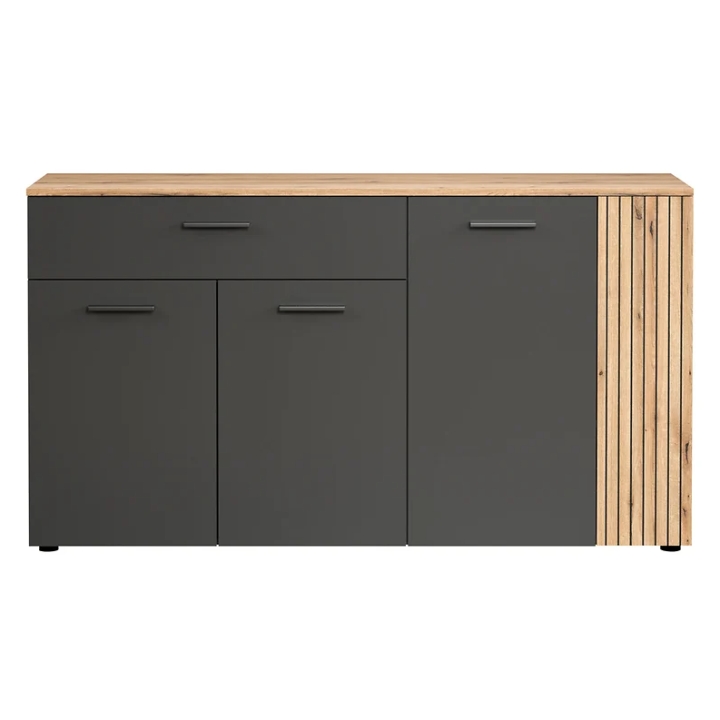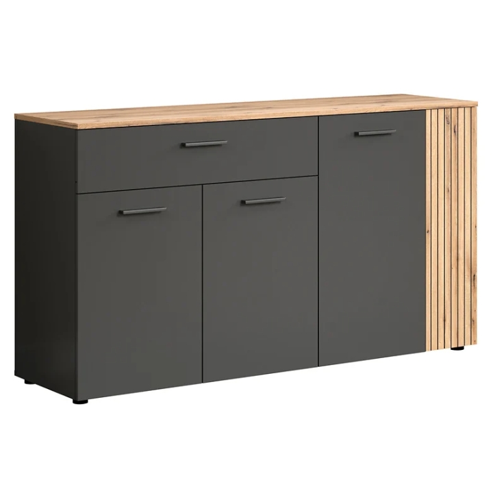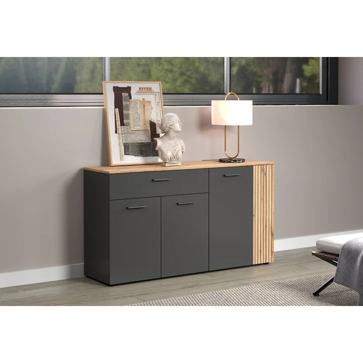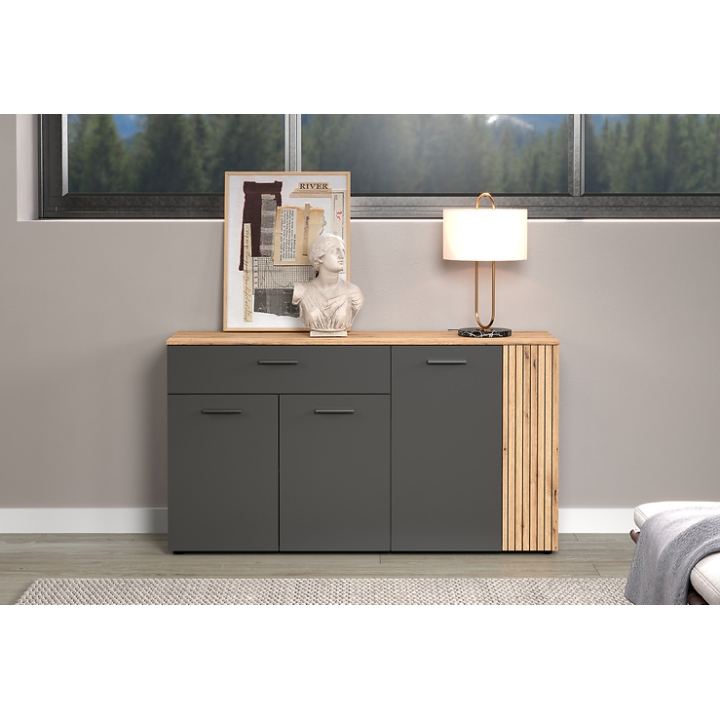 Made of furniture board, the Esteban chest of drawers is distinguished by a subtle colour combination of graphite and oak evok. The oak-coloured body brings a warm, natural atmosphere to the interior, while the contrasting graphite fronts add a distinctive touch. The milled and patinated grooves on the doors emphasise the construction of the furniture, giving it a unique look that easily finds its way into modern and loft settings.