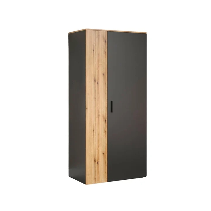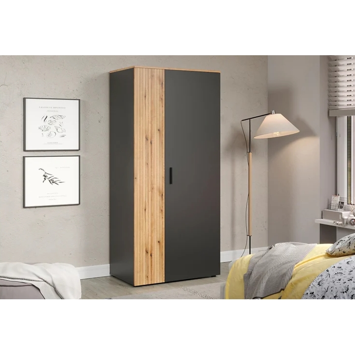 The body in the colour of oak evok contrasts harmoniously with the graphite finish of the door. Milled and patinated grooves on one of the fronts add a unique character to the wardrobe, creating a striking play with the smooth surface of the other leaf. Such a juxtaposition of colours and details makes the piece of furniture an interesting decorative element, attracting the eye and making the interior expressive.