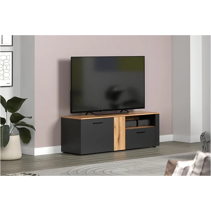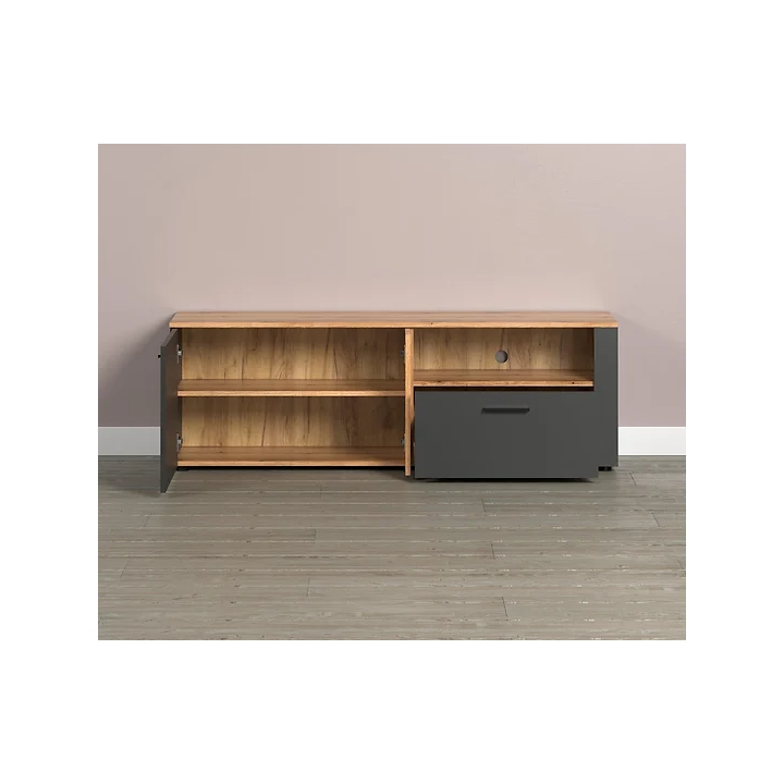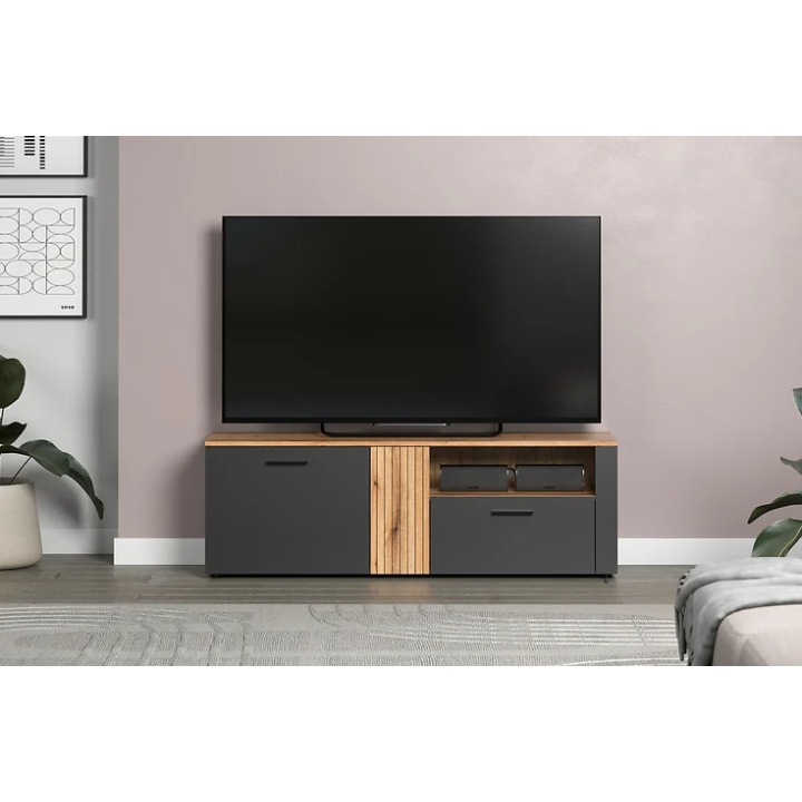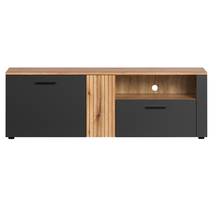 The furniture features an open recess under the top, which creates a convenient space for storing the set-top box, putting away the remote control or other small items. The space also offers a cable hole for the aesthetic placement of multimedia equipment. Two spacious cabinets and one drawer provide space for discs, books, magazines and other essential accessories. The contrast between the dark graphite front and the warm shade of the evok oak gives the entire unit a unique character, emphasising the modern style of the interior. The milled details on the door are a clear decorative element, making the cabinet stand out.