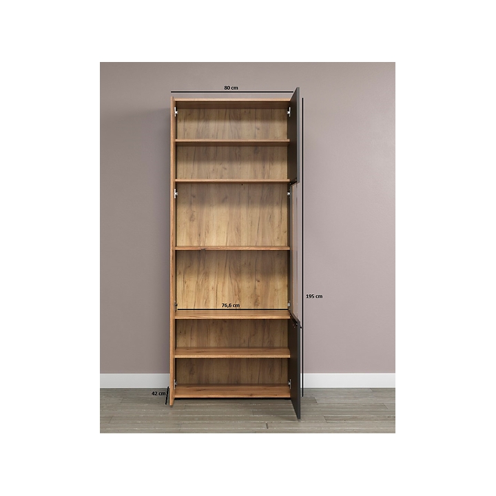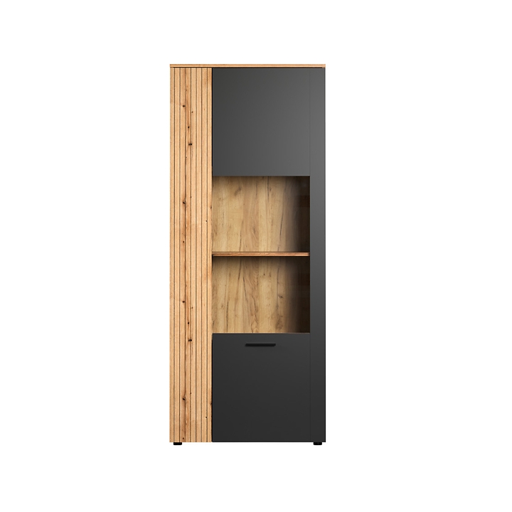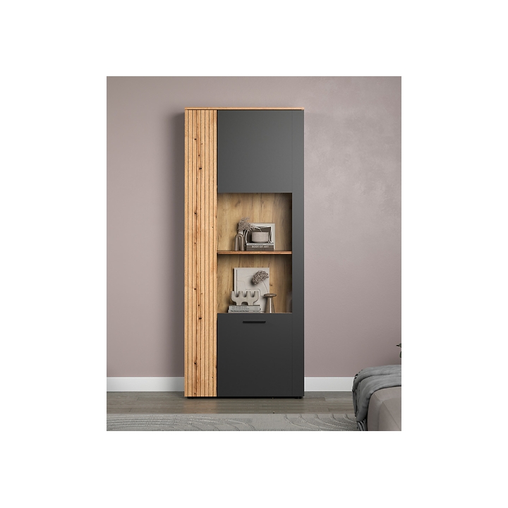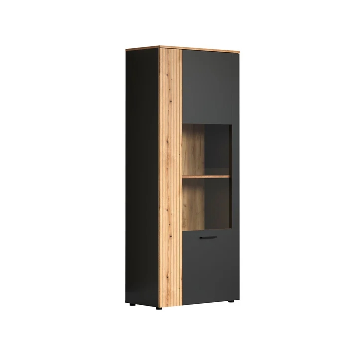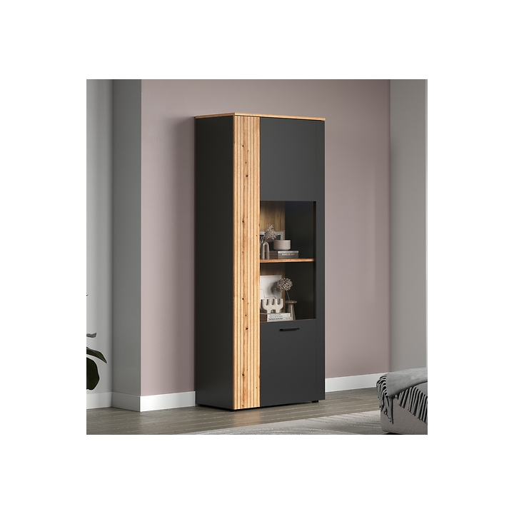 Esteban REG1W1D/80two-door display cabinet by BRW manufacturer in graphite and oak evok is a piece of furniture that blends into modern design trends, combining simplicity with refined form. Built from high quality furniture board, it guarantees both solidity and an aesthetic appearance. The display cabinet measures 80 cm wide, 195 cm high and 42 cm deep, and its total weight is 64 kg, ensuring stability and resistance to damage. An additional advantage is the quiet and even door closing system and the scratch-resistant laminate, which significantly increases its durability.