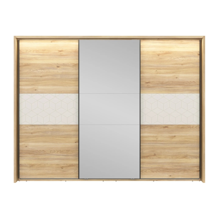 The central front with a large mirror fulfils a double role - it allows you to try on clothes comfortably and at the same time visually enlarges the room. The other two fronts are decorated with a cashmere surface combined with mauvella oak colouring and a geometric décor characteristic of the Glamour collection. This combination of materials creates a strong visual effect that draws the eye, emphasising the character of the arrangement - whether in a modern or classic interior.