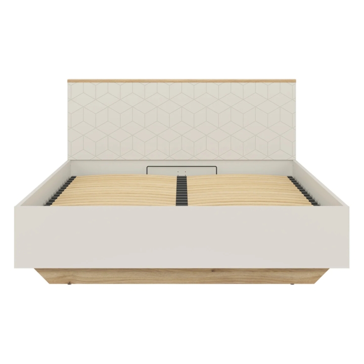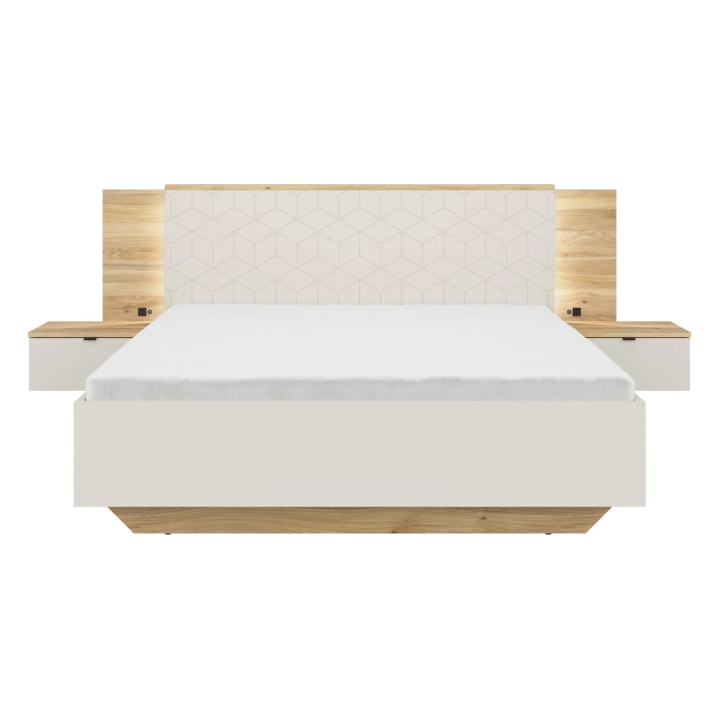 The Glamour 160x200 bed with container and frame cashmere/mauvella oak is for those who want to create a special atmosphere in the bedroom. The combination of the sophisticated cashmere décor with the natural shade of mauvella oak is eye-catching and adds to the cosiness of the interior. The high, upholstered headrest with geometric pattern becomes the focal point of the arrangement - suitable for both modern and more decorative interiors.