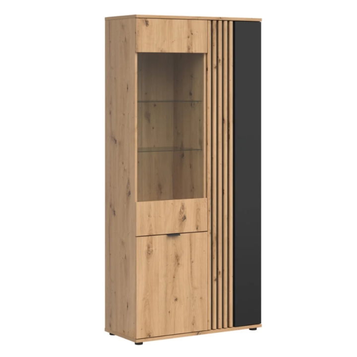 The Vabres 90 cm showcase with 3 doors is a unique piece of furniture that combines a modern look with a large capacity. The warm colouring of artisan oak combined with black and three-dimensional MDF slats on part of the fronts creates a distinctive visual effect, ideally suited to interiors decorated in loft, industrial or modern style.
