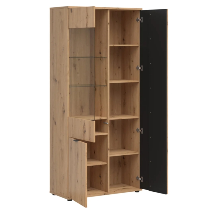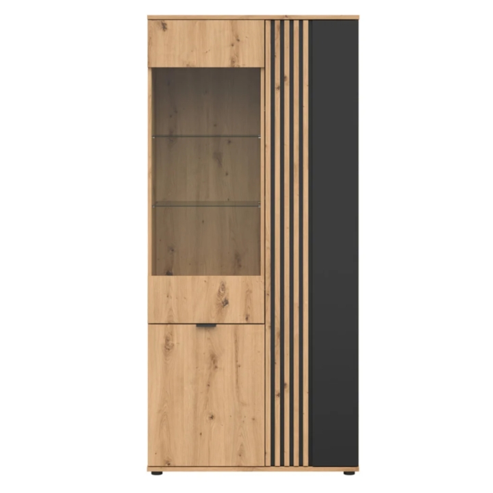The body and full fronts are made of laminated board - durable and easy to care for. The display cabinet offers three spaces behind the doors - two full and one glazed. The shelves hidden behind the fronts are the ideal place for everyday objects, while the display section allows you to display decorations, porcelain or your favourite books. The lighting, available as an additional option, will highlight the contents of the display cabinet and give the interior a cosy atmosphere.