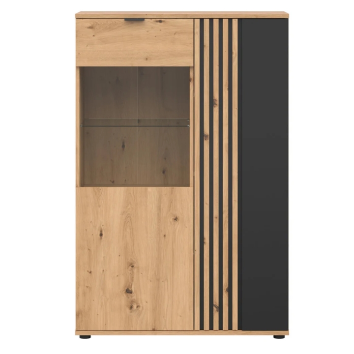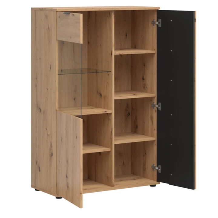 The interior of the furniture is divided into functional zones: behind the full fronts you will find six closed compartments where you can organise your dishes, textiles or documents. The two display shelves behind the glass provide space for books, china, souvenirs or decorations. The lighting (optional) accentuates the contents of the glass section and creates an atmospheric atmosphere.