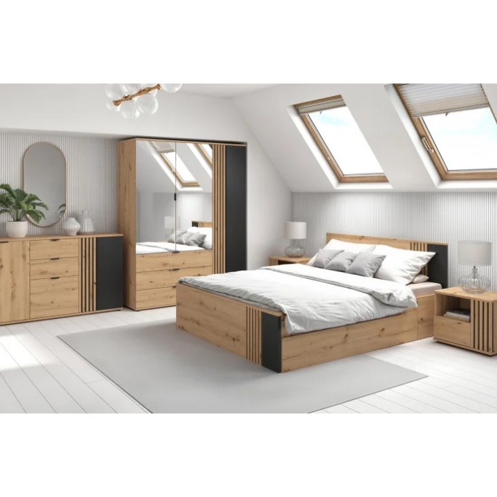 The Vabres 55 cm right-sided nightstand with drawer is a modern proposal for the bedroom, which combines an attractive appearance with convenience of use. The form of a compact cubicle, the colouring of oak artisan and decorative MDF laths on the front make the piece of furniture fit in with current interior trends, especially those inspired by loft and Scandinavian style.