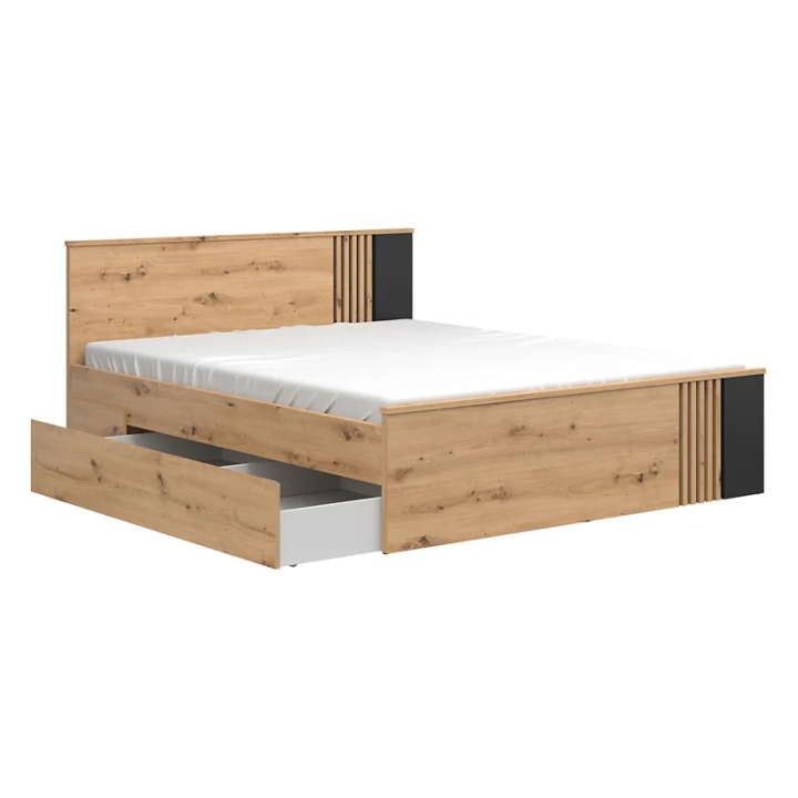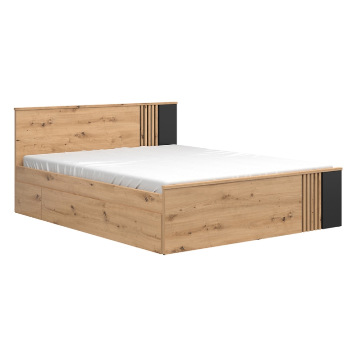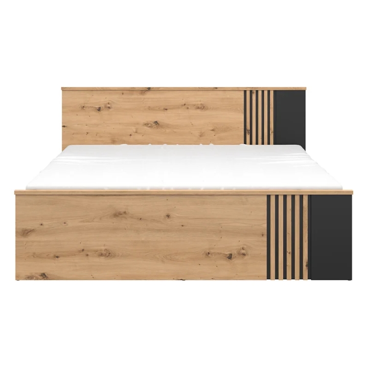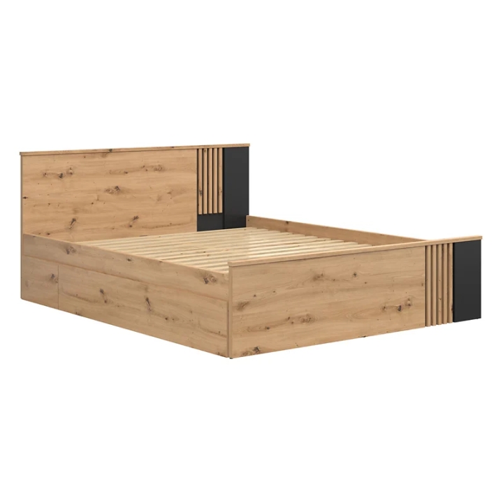 The Vabres 160x200 oak artisan bed with slats is a modern proposal for those who appreciate the combination of function and refined design. The bed is distinguished by a decorative MDF slatted motif, which decorates the headboard and adds depth to the piece. The whole set is maintained in a warm shade of artisan oak, complemented by contrasting black inserts.