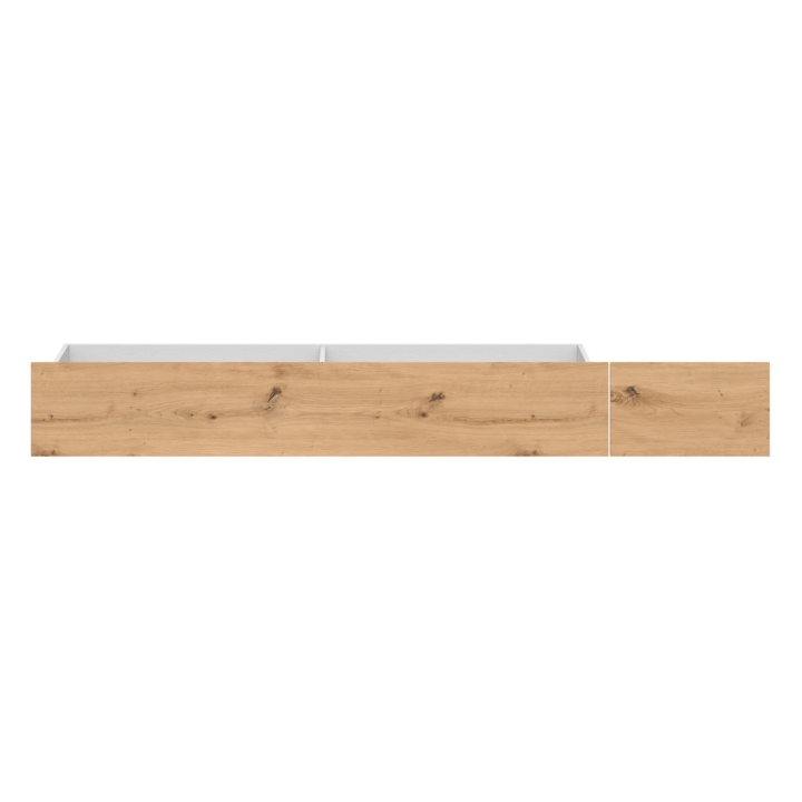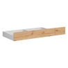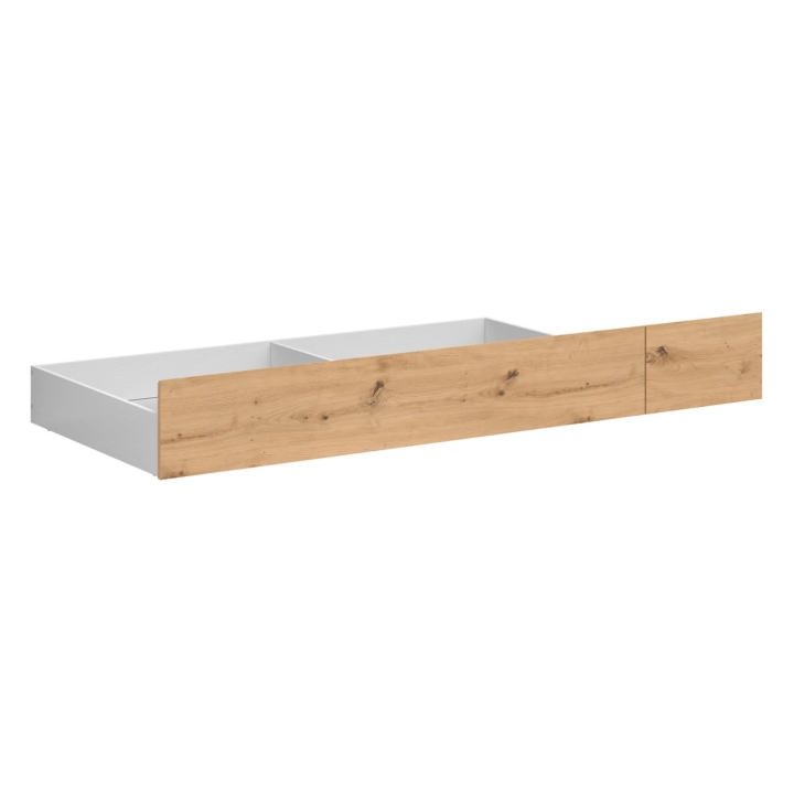 The drawer for the Vabres 160 oak artisan bed is a way to conveniently store bedding and keep your bedroom tidy. It was designed for the Vabres bed with a sleeping surface of 160 × 200 cm and fits perfectly with the style of the entire collection. Its warm finish in artisan oak works perfectly with the natural arrangements and black details present in the other furniture in the series.
