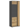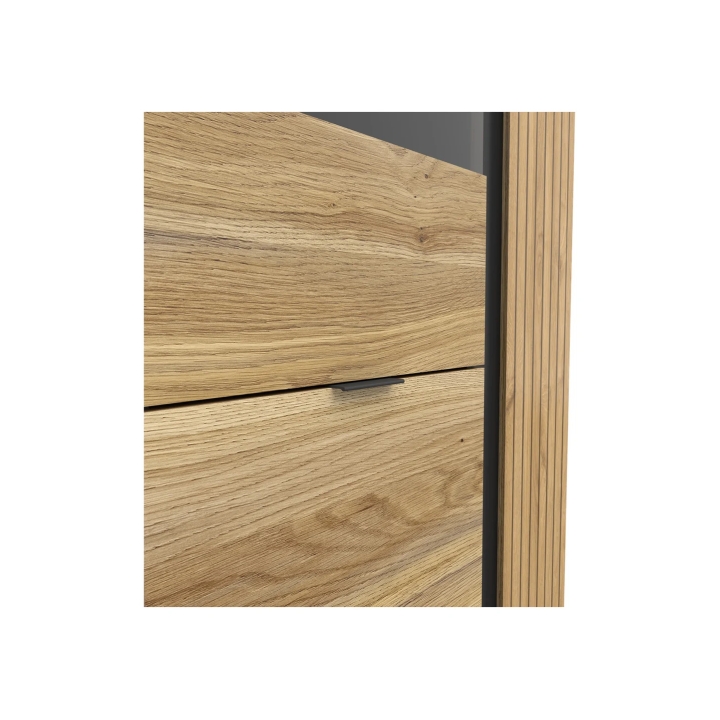 The black carcass sets a strong accent, while the fronts in mauvella oak décor bring a sense of warmth to the interior. The laths complete the form, attracting attention and giving the display an original character. Inside, there are shelves made of toughened glass - resistant to loads and perfect for display.