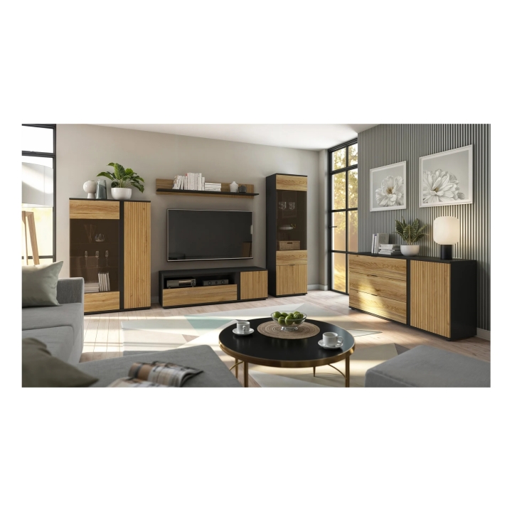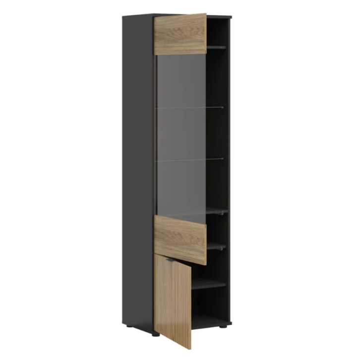 The Luen 57 cm showcase is for those who want to display decorations and organise space in the living room, dining room or office. The slim body combines a modern look, careful details and display function. There is a glass front on the left side, behind which solid tempered glass shelves are placed. This is a space created for decorations, souvenirs, porcelain or book collections. On the right side, a closed front with a lamella print is used to mask the contents and protect them from dust. This solution keeps things tidy without sacrificing visual appeal.