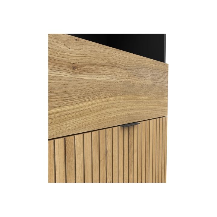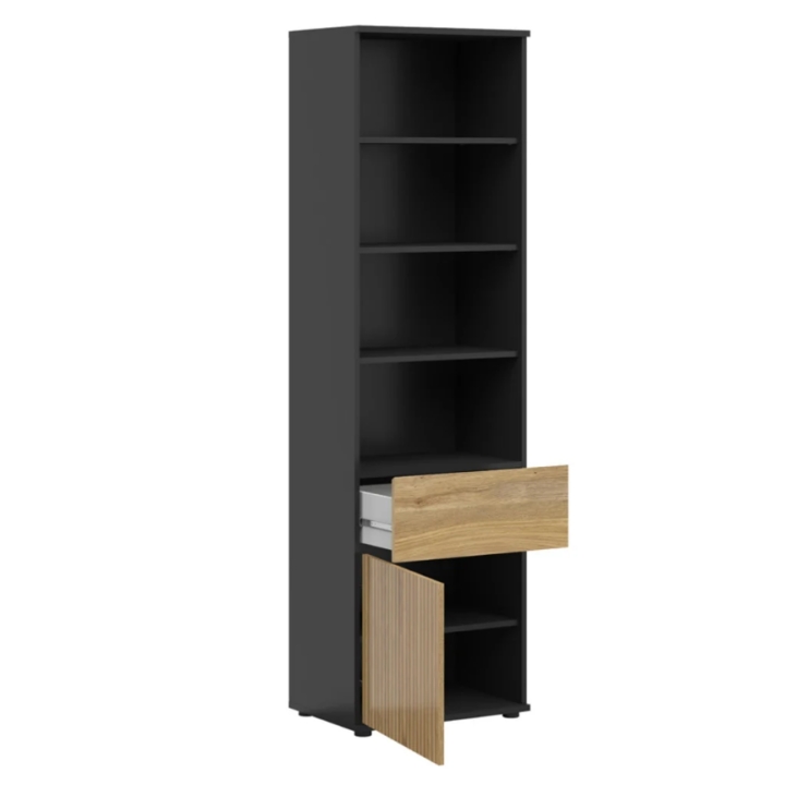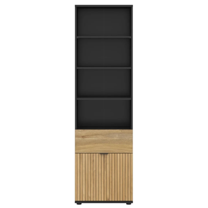 The lower part of the bookcase has a capacious drawer for small items and a lockable cabinet with a decorative front in the form of printed slats. This combination makes it easy to hide less representative items without losing visual coherence. The mauvella oak finish adds a warm touch inspired by natural wood, while the matte black body provides a clear background for the exposed elements.